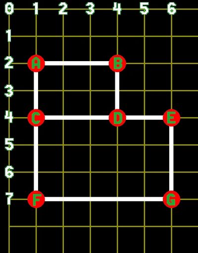 The image on the right shows 7 nodes labeled A-G. These nodes are connected together with white lines that represent the paths between these nodes. As you can see node A has two neighbors: nodes B and C. Node D has three neighbors: nodes B, C, and E. The numbers on the edges show what row and column each node is in. Node B, for example is in row 2, column 4. We are going to write up some code in order to draw these nodes and their connections onto our screen.